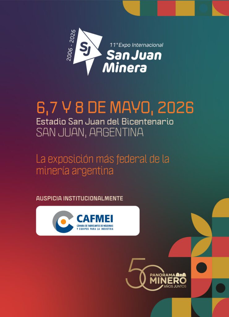 Desde la Cámara de Fabricantes de Máquinas y Equipos para la Industria (CAFMEI) nos enorgullecemos de anunciar el auspicio institucional en la 11ª Expo Internacional San Juan Minera, uno de los encuentros más importantes del sector minero argentino, que se realizará del 6 al 8 de mayo de 2026 en San Juan, Argentina. 🏛️📊