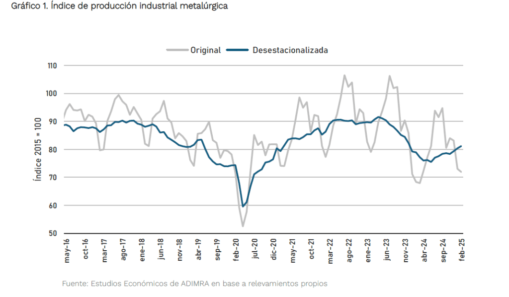 Durante febrero del 2025, la actividad metalúrgica registró una variación interanual de 5,3% y un aumento de 1,0% con respecto al mes pasado. e esta manera, el sector acumula un crecimiento de 3,9% durante el año, en la comparación contra el mismo período del 2024.